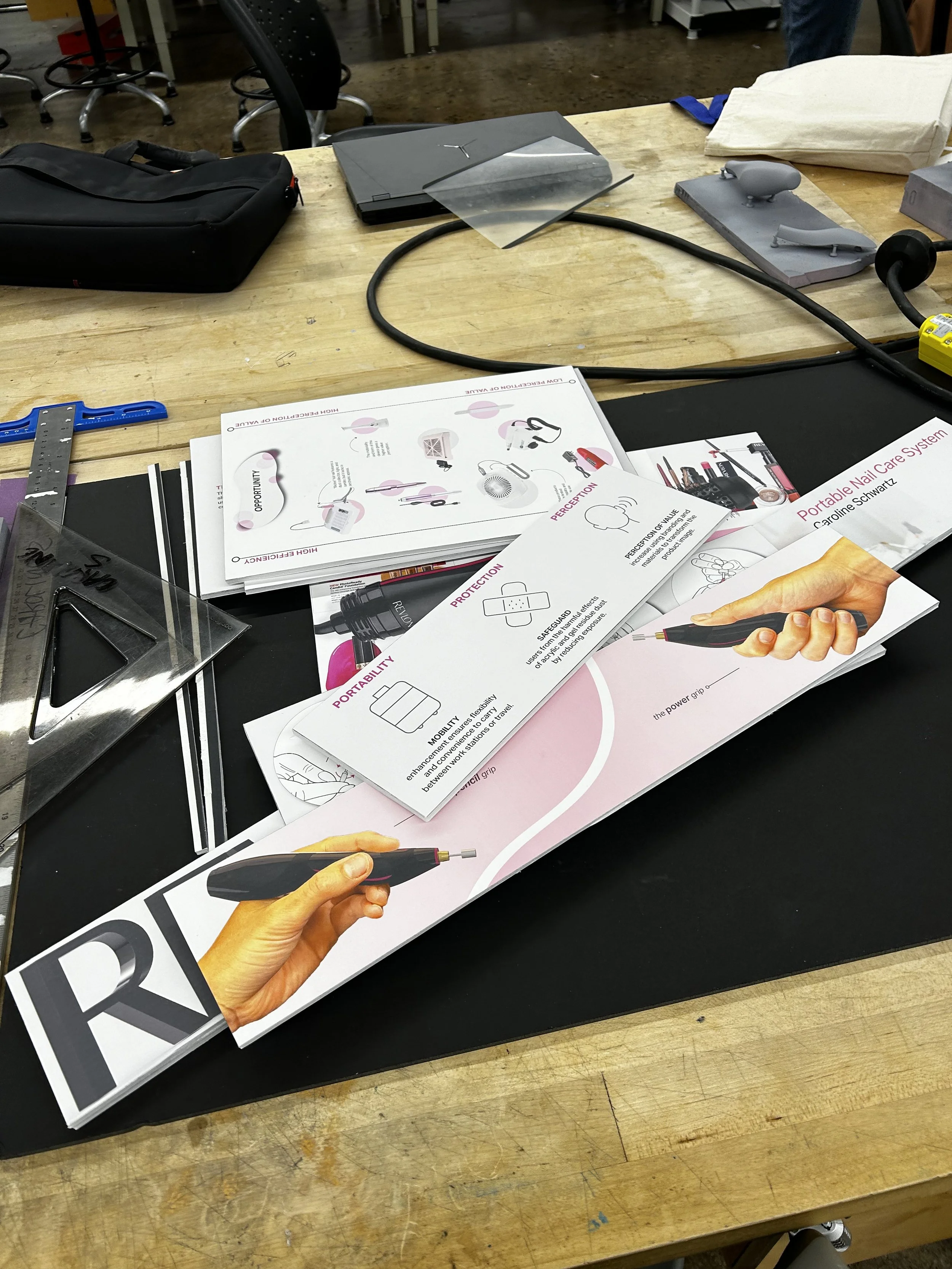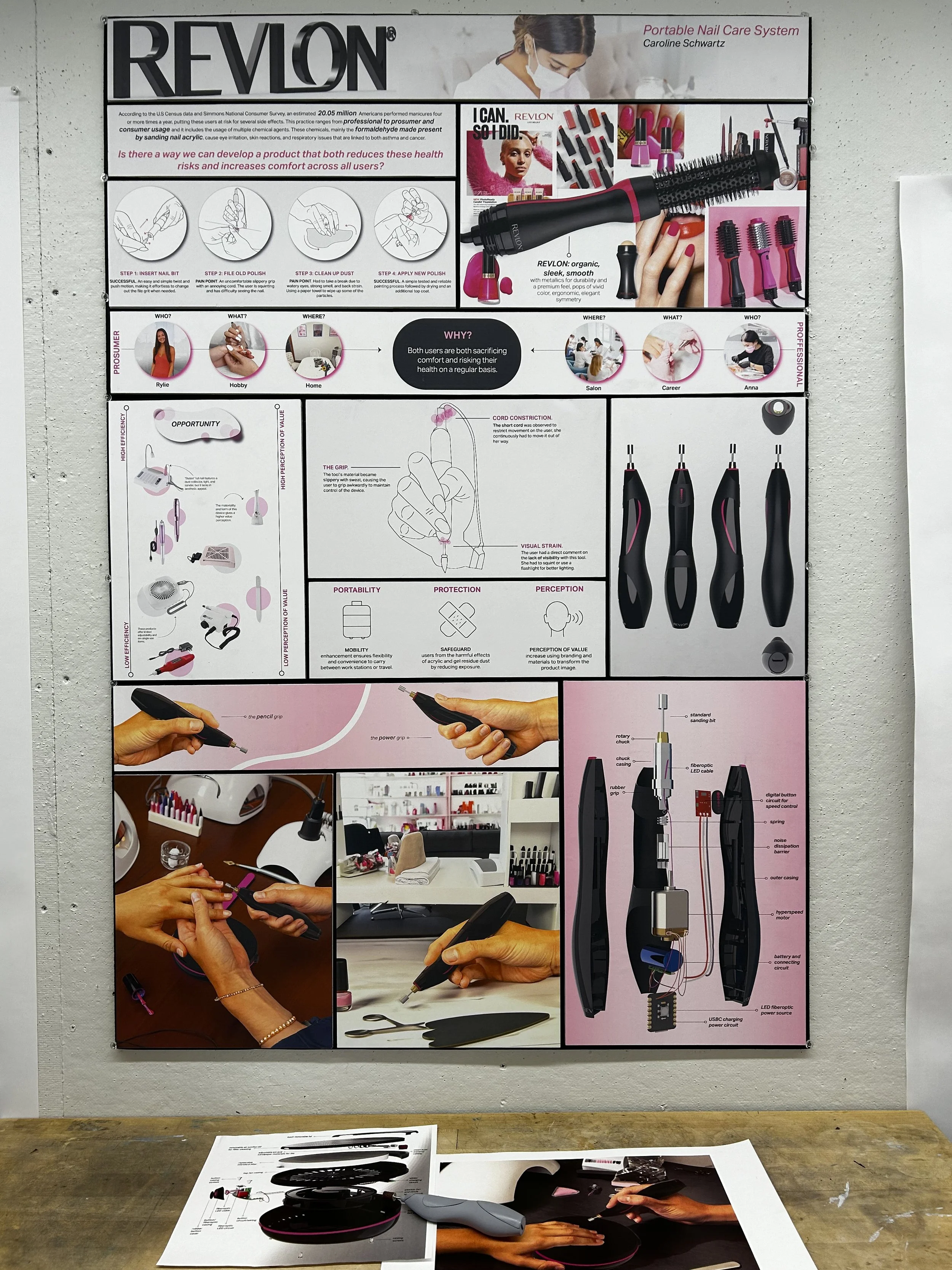 Redesigning the Electric Nail File with an added electric dust collector for the Revlon Brand Identity. Focusing on safety features, ergonomics, portability, and perception of value.