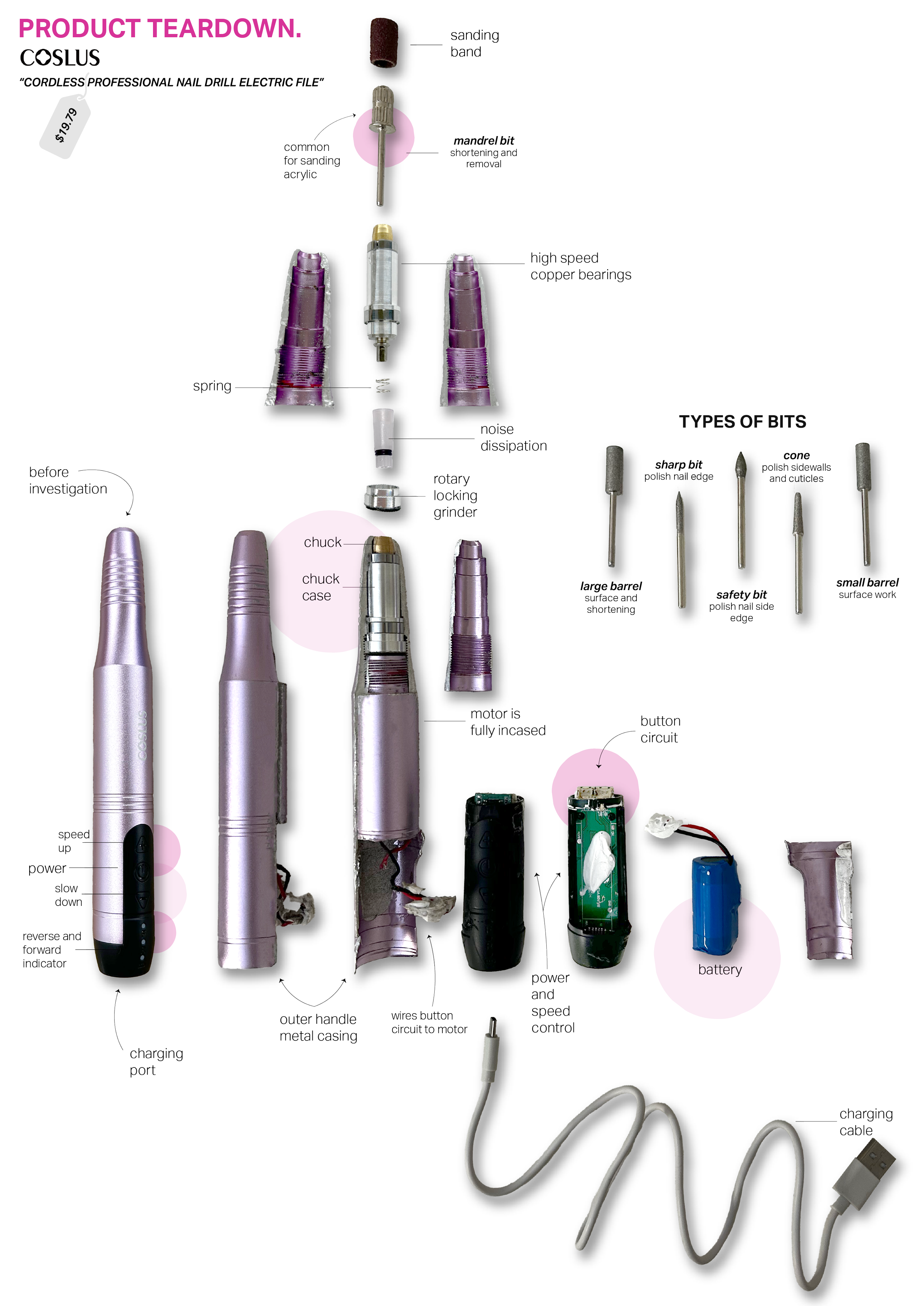 Carefully disassembling my analogous tool, the Coslus brand electric nail drill and documenting its components and structure, noting parts in an exploded knolling style layout.