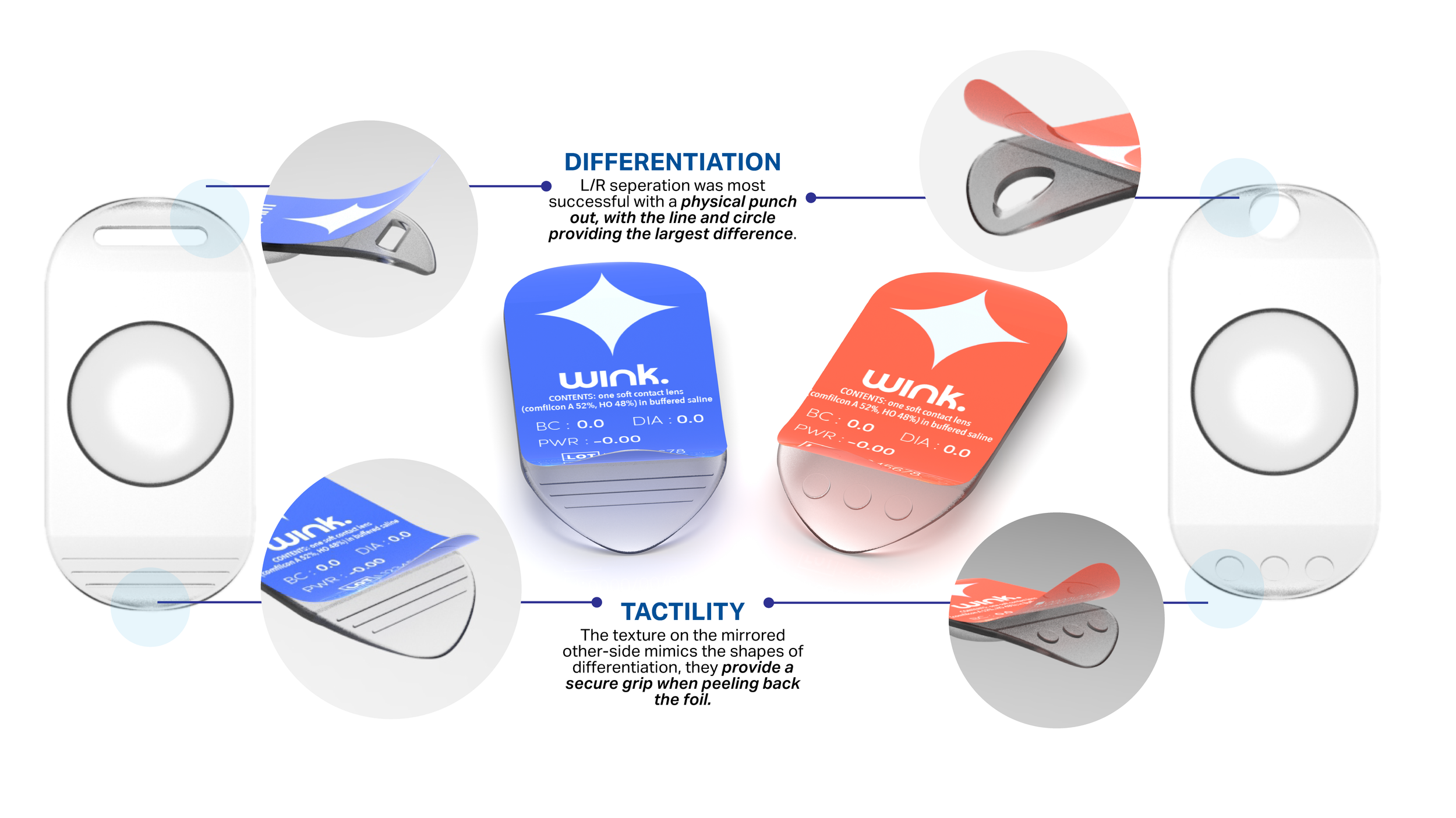 According to the Centers for Disease Control and Prevention (CDC), an estimated 45 million Americans wear contact lenses, with nearly 90% of new wearers choosing daily disposables for the easy convenience. This comes at a cost up to five times higher than monthly prescriptions, yet 1 in 3 users struggle with handling, including opening packages to distinguishing lenses in dim lighting / without their corrective glasses on. Current packaging often tears inconsistently, leaves contacts loose, and lacks any sort of powerful premium branding.